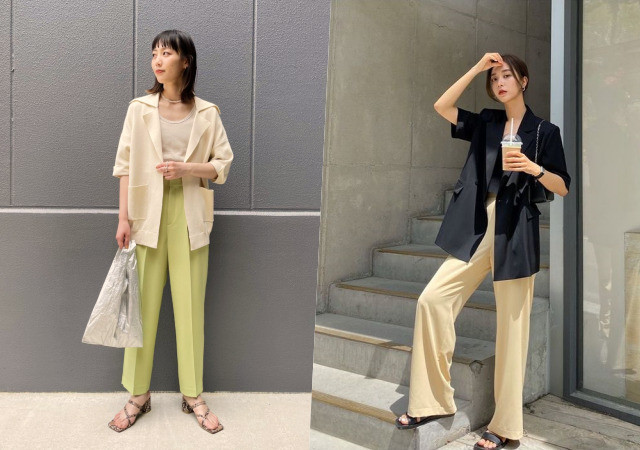 短袖西装外套里面除了能穿 T 恤、衬衫,还能穿平口小可爱、短版细肩带上衣等,为看起来比较正式的西装加上休闲感,因此下身可以穿跟外套颜色同样冷 / 暖度的跳色西装裤,如果怕认颜色出错的话也可以直接穿牛仔裤,马上就得到亮眼街头 look 。