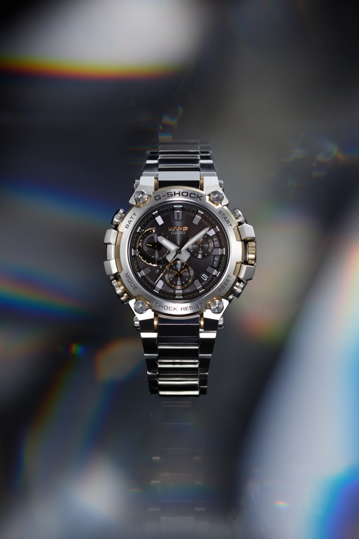 MT-G「金银」表圈经离子电镀处理呈现金色,并采用拉丝加工重新打磨,巧妙地只露出凸起部分的不锈钢。金色与银色的碰撞,让腕表上演出截然不同的型格,也赋予时间焕然一新的质感。此外,高透光率的人造蓝宝石玻璃镜面搭配微细加工技术与蒸镀工艺也为表盘增添精致质感,当坚韧回归于本质,金与银的多重魅力自然分明。