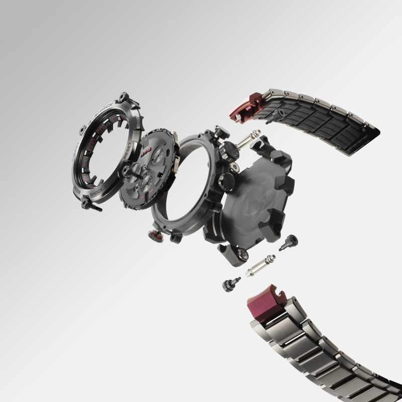 为了满足这种新型超薄模块所需的全新抗震结构,MTG-B3000系列搭载了更先进的双核防护结构。新开发的防护结构使用碳增强树脂外壳保护模块,结合金属部件封闭外部,在减轻重量的同时保留金属外观和质感。其核心是有凸面的不锈钢后盖,经过反复压制、切割和抛光,制成一个向上突出的爪状结构,凸起的侧面不仅可以保护表冠和按钮,还可以用作固定表带的凸耳。金属零件之间精密咬合,在实现纤薄轮廓的同时造就了复杂而刚毅的型格,于腕间加持硬朗气场。