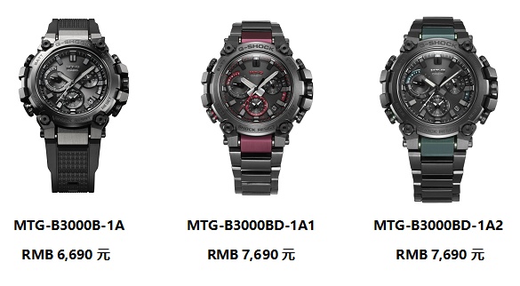MTG-B3000B系列主要功能:防震、200米防水、六局电波、碳纤核心防护构造、3G防护构造、太阳能动力、蓝宝石玻璃镜面、第二时间功能、12/24小时时制、蓝牙连接功能、高亮度LED照明、指针位置自动修正、秒表(1秒)、倒计时、每日闹铃、全自动日历、夜光、节电功能、低电量警报