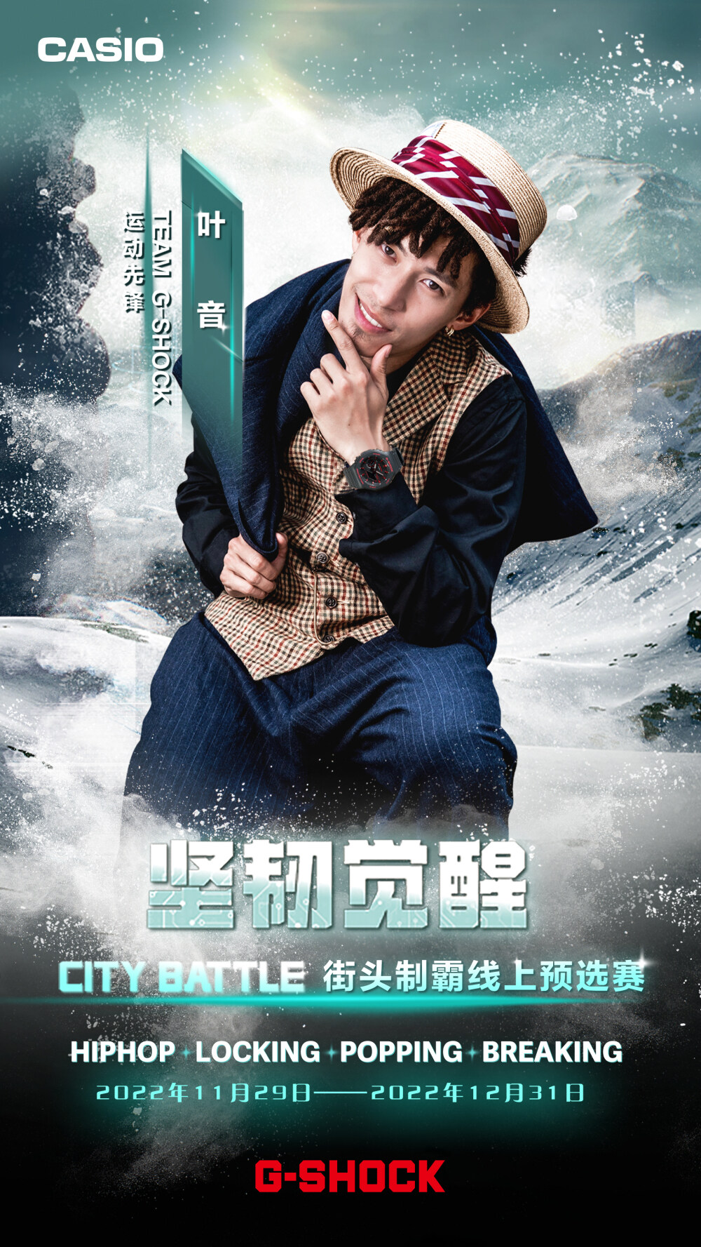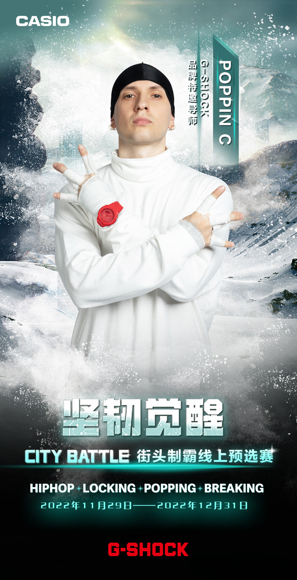 11月29日-12月31日,可通过G-SHOCK抖音官方(卡西欧手表)活动页参与线上挑战赛,用你的舞步彰示你的热爱!四位明星导师将根据线上参与者的热情演绎,选出8强出征CITY BATTLE总决赛。于此同时,线下对抗赛也将开启四场激烈对决,并由明星导师选出各场4强选手,组成线下16强。其中,在各场Battle中斩获冠军的选手将直接晋级决赛,而剩余的12名选手并非直接淘汰,而是仍将有机会获得最终晋级名额。12月27日-12月31日,G-SHOCK 将为12名选手开启复活投票通道,登陆「G-SHOCK WORLD」微信小程序为你喜爱的选手投票,就有机会见证他逆风翻盘!得票数最高的4名选手即复活成功,获得总决赛参赛资格,晋级名单将于12月31日在G-SHOCK官方账号公布!