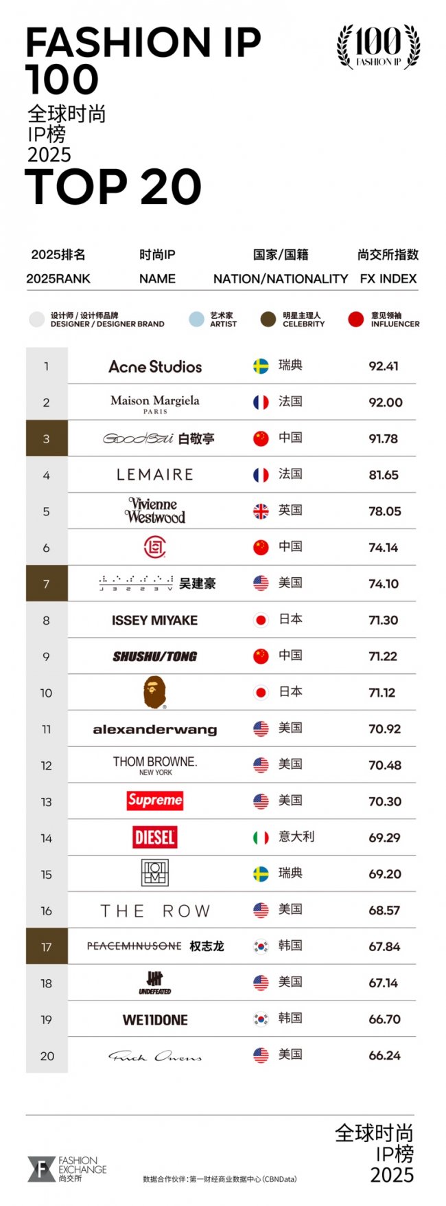 2025年,中国本土时尚IP表现实现群体性突破。共有21位中国时尚IP上榜,与美国、日本数量趋近。在总榜排名上升的47个时尚IP中,有12个来自中国,中国成为上升时尚IP最多的国家。在经历2024年本土时尚IP集体缺席TOP10后,2025年白敬亭主理品牌GoodBai、陈冠希主理品牌CLOT、设计师品牌SHUSHU/TONG强势进入总榜前十,标志着本土创意在市场顶端话语权的回归。