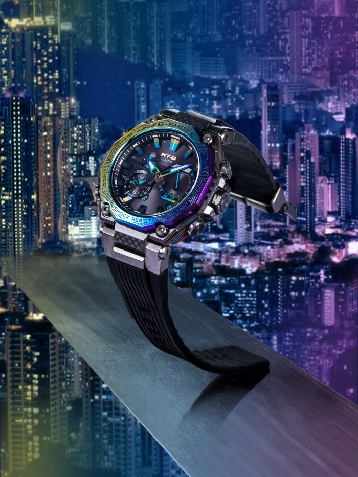 都市繁华的夜景,是此次新品「夜幕之都」的灵感所在。MTG-B2000YR-1A在MG-B2000系列的基础上,揽都市夜幕于腕上方寸之间,开启摩登生活与高级制表工艺的交锋。碳纤维与多彩玻璃纤维混搭层压,构成多层碳纤维框架,以璀璨光影于夜幕辉映,成就品味和质感。