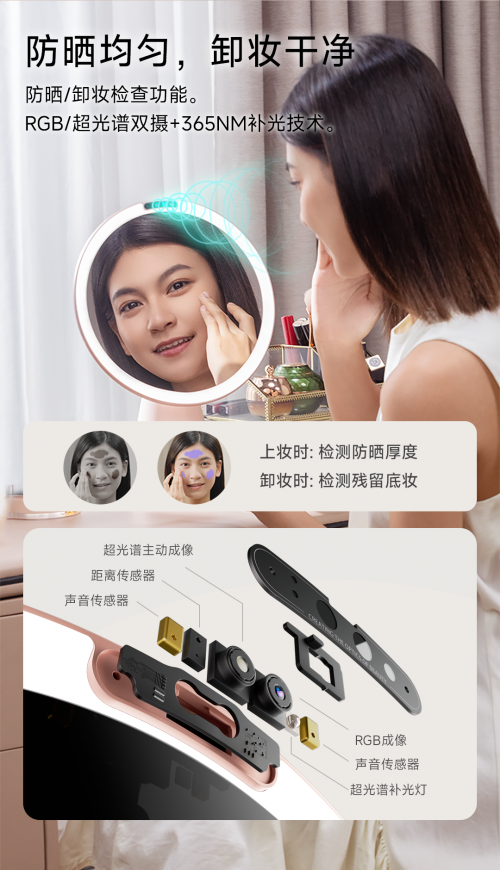 更令人惊喜的是,智能美妆镜S1还具备了一项独特功能——紫外防晒检测。搭载独家超光谱成像摄技术,涂抹防晒妆品后,用户可通过镜面直观看到防晒妆品的涂抹情况及漏涂区域,确保防晒无死角。卸妆时也能快速识别防晒妆品残余的地方,让防晒管理更精准、更高效。