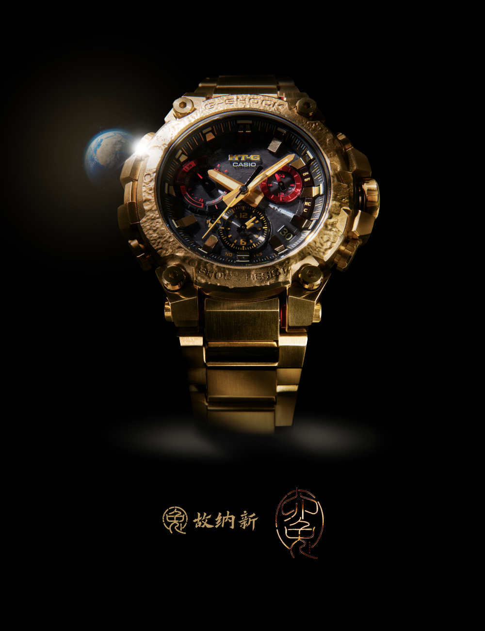 奢感金色在新年之际更添美好祈愿,将不凡融入日常。G-SHOCK MT-G兔年生肖款以金色IP涂层覆盖腕表表圈、表壳及表带,呈现不断精进的至臻工艺与坚韧精神,以高品质感为硬朗造型注入隽永格调。此外,腕表的两个小表盘还特别采用了红色,代表着月兔的红眼睛。在黑与金的映衬下,解锁灵动魅力。
